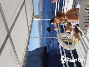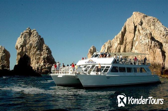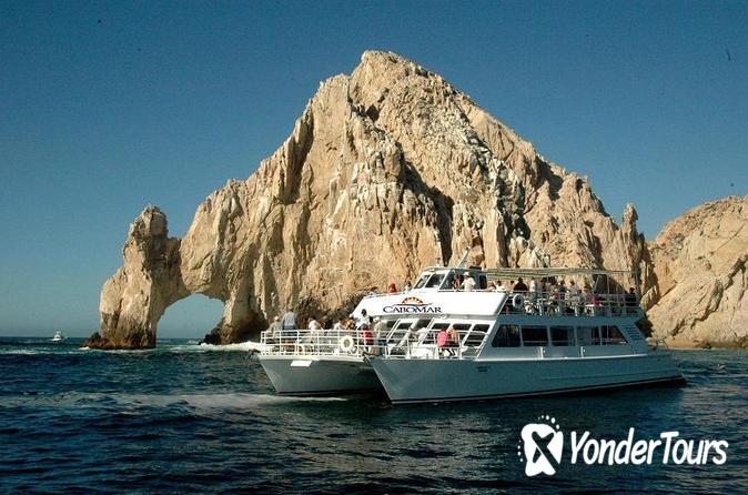 In the evening, make your way to the Cabo San Lucas marina and board the Cabo Mar, a power catamaran. Head to the open international bar to order unlimited drinks (including wine, beer, blended cocktails, and mixers), and get unobstructed views from the upper deck where a large shaded area provides a retreat from the sun.You'll embark on a 2.5-hour fiesta cruise that includes sightseeing at natural attractions such as Pelican Rock, Lover's Beach and Neptune's Finger. See where the Sea of Cortez meets the Pacific Ocean at Land's End, and glide past the Arch and a sea lion colony while you search the waters for migrating whales.Heading back to the bay, your captain sets anchor during a buffet dinner. The menu includes steak and chicken tacos, quesadillas, homemade salsas, beans, rice, guacamole, grilled veggies, tortillas, and chips. After dinner, head upstairs where the DJ and spirited crew will get you moving to the Latin-inspired music and today's top hits.